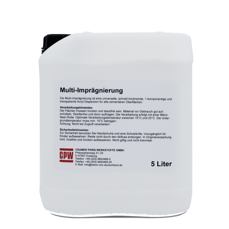Verarbeitung: Die Béton Ciré-Fläche muss staubfrei und trocken sein. Gebrauchsfertige Mischung. Tragen Sie die Multi-Imprägnierung dünn, gleichmäßig und streifenfrei mit einer Velours- oder Schaumstoffwalze auf. Die Multi-Imprägnierung hat eine farbvertiefende Wirkung. Verwenden Sie die ausführliche Anleitung um die Arbeitsschritte korrekt auszuführen.